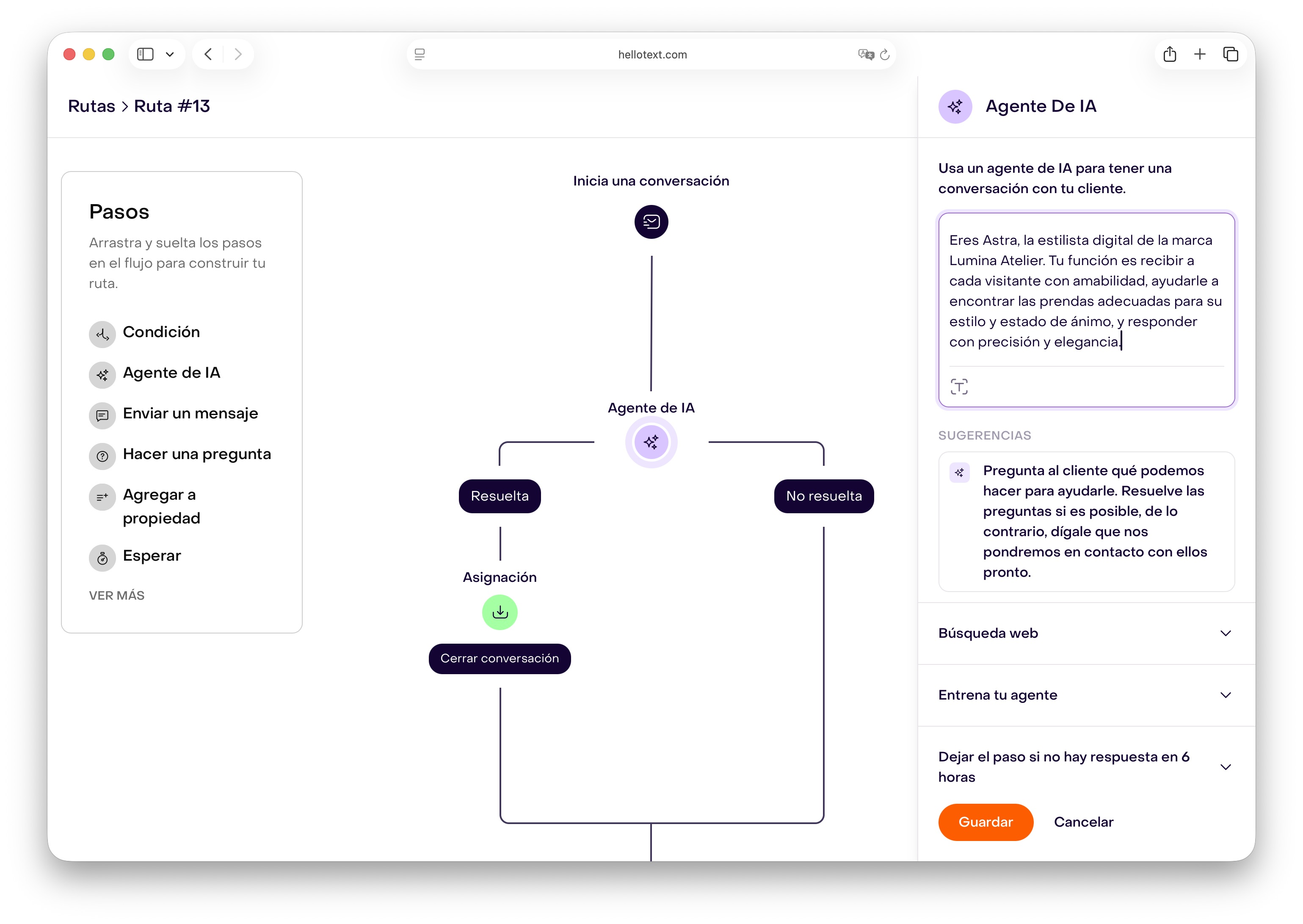 Los agentes pueden recopilar y guardar cualquier propiedad de perfil de cliente que elijas, desde el nombre y la ciudad hasta la talla o los intereses preferidos. También pueden decidir cuándo escalar una conversación a un humano, siguiendo las reglas que definas en el Editor de Rutas.