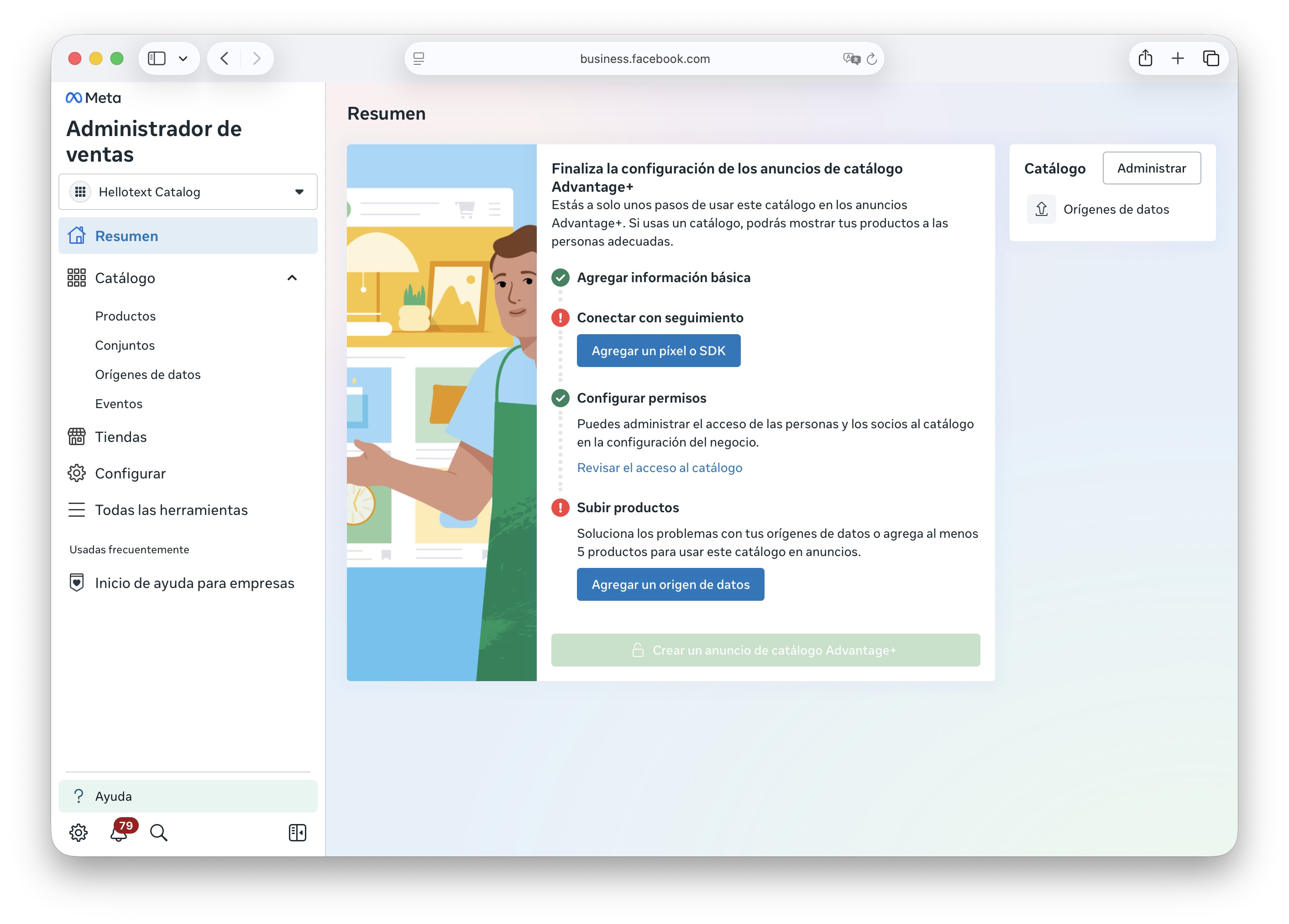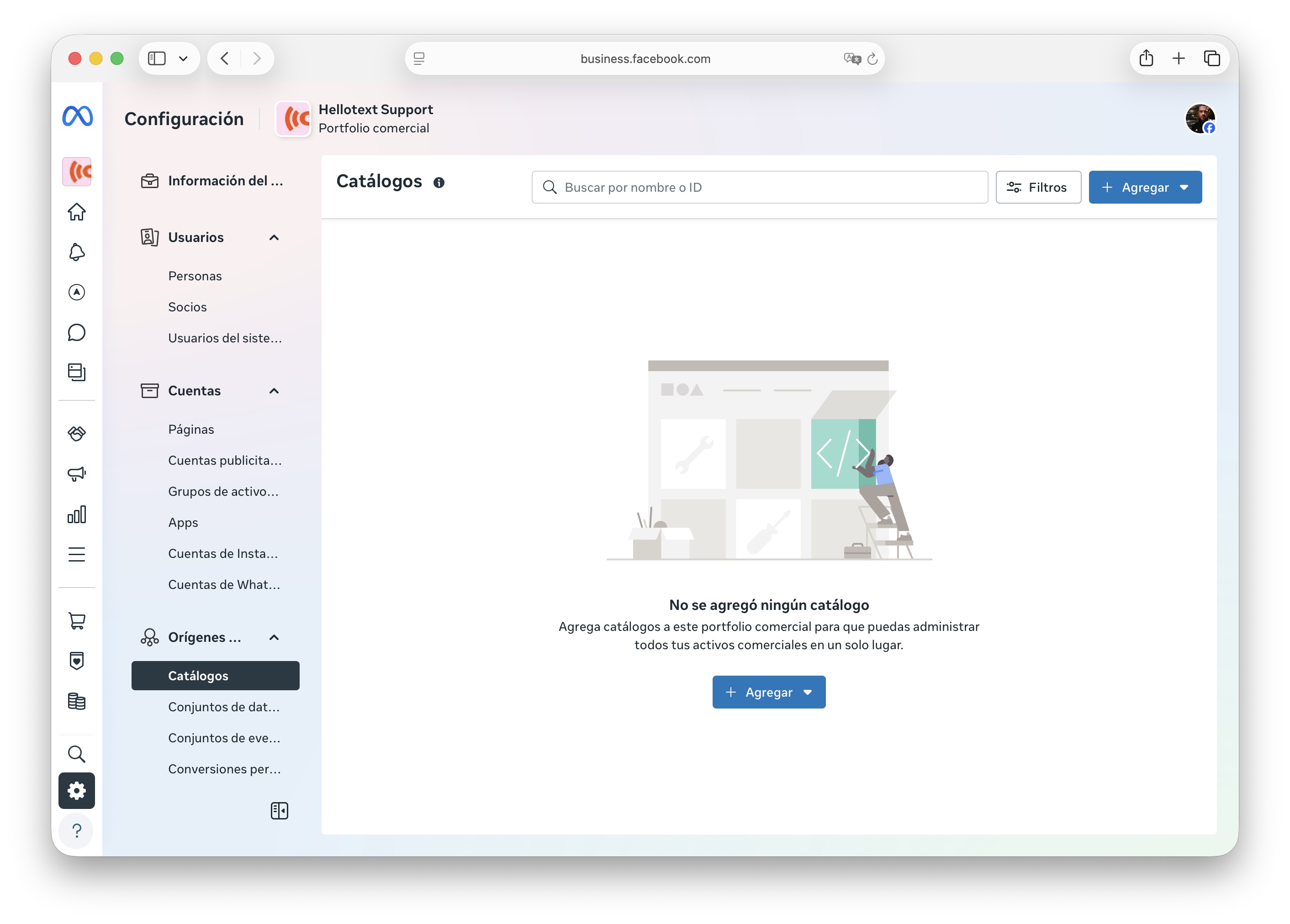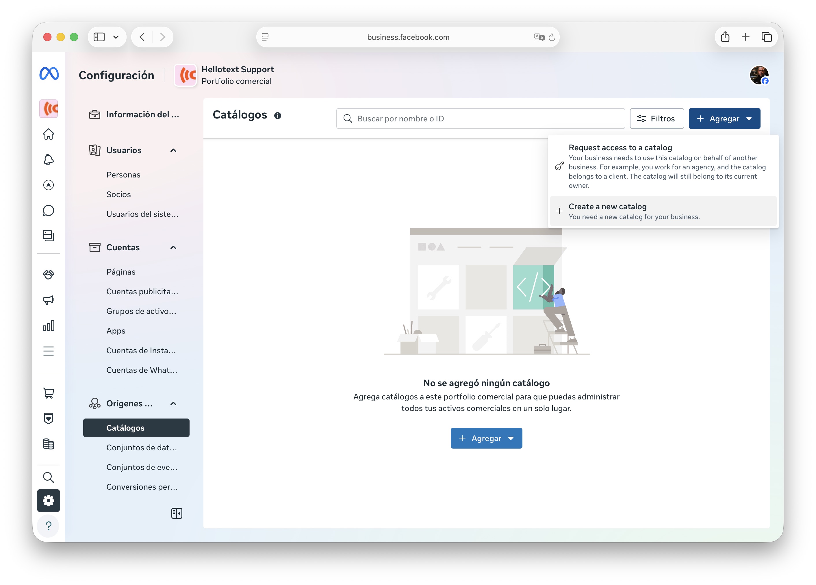 Si ya creaste un catálogo previamente para Hellotext, puedes utilizarlo sin ningún problema. Pero si todavía no tienes uno, deberás crear un catálogo nuevo en Meta para poder usarlo en WhatsApp.