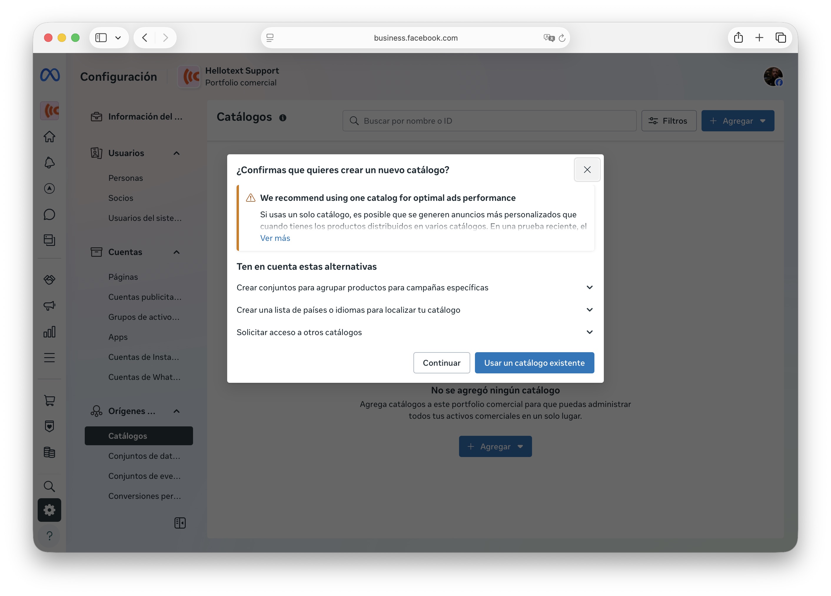 Meta mostrará una ventana emergente. Elige Continuar, incluso si ya ves otros catálogos creados. Queremos asegurarnos de generar uno nuevo desde cero.