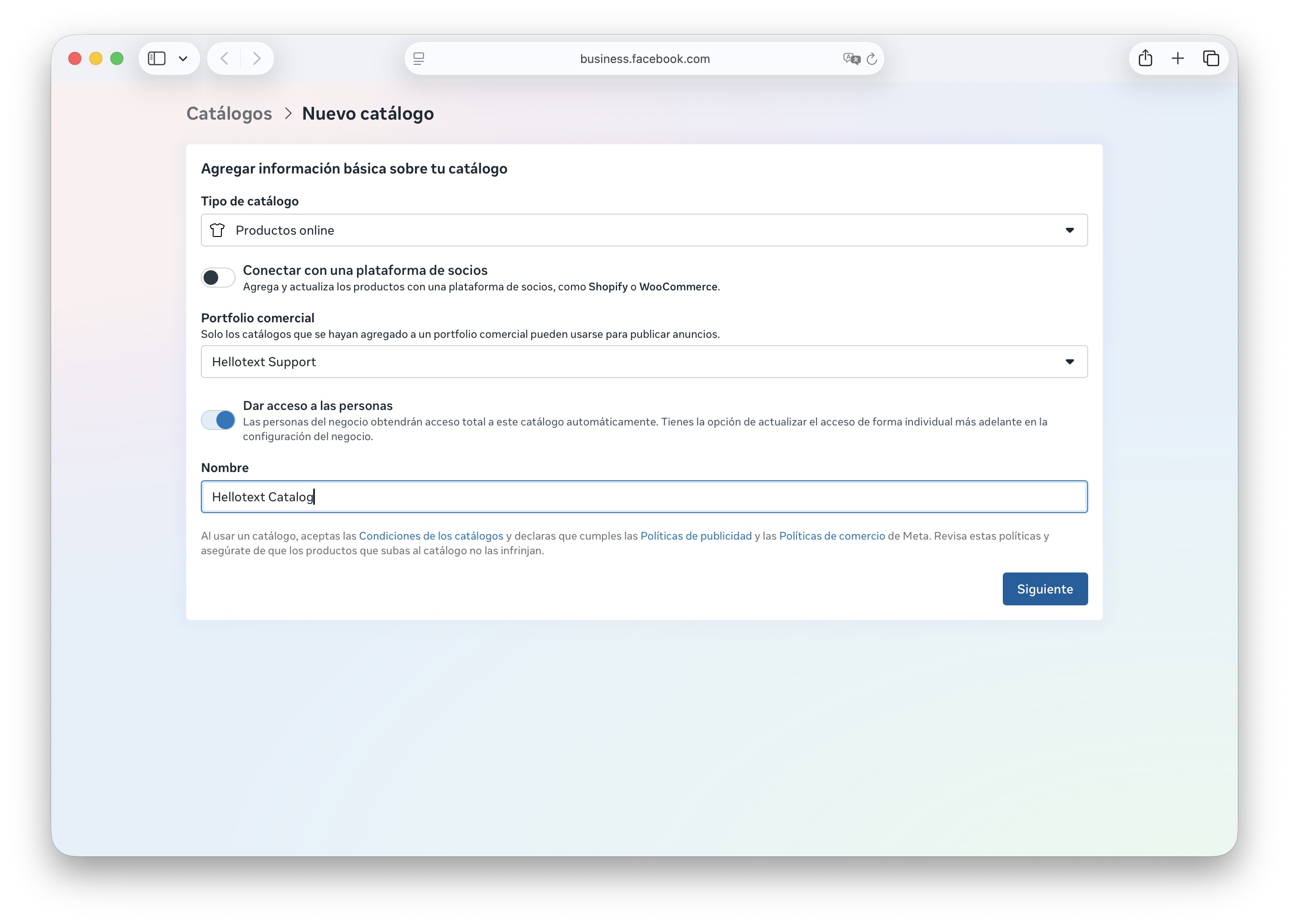 En el campo Nombre, escribe Hellotext Catalog, deja el resto tal como está y haz clic en Siguiente.
