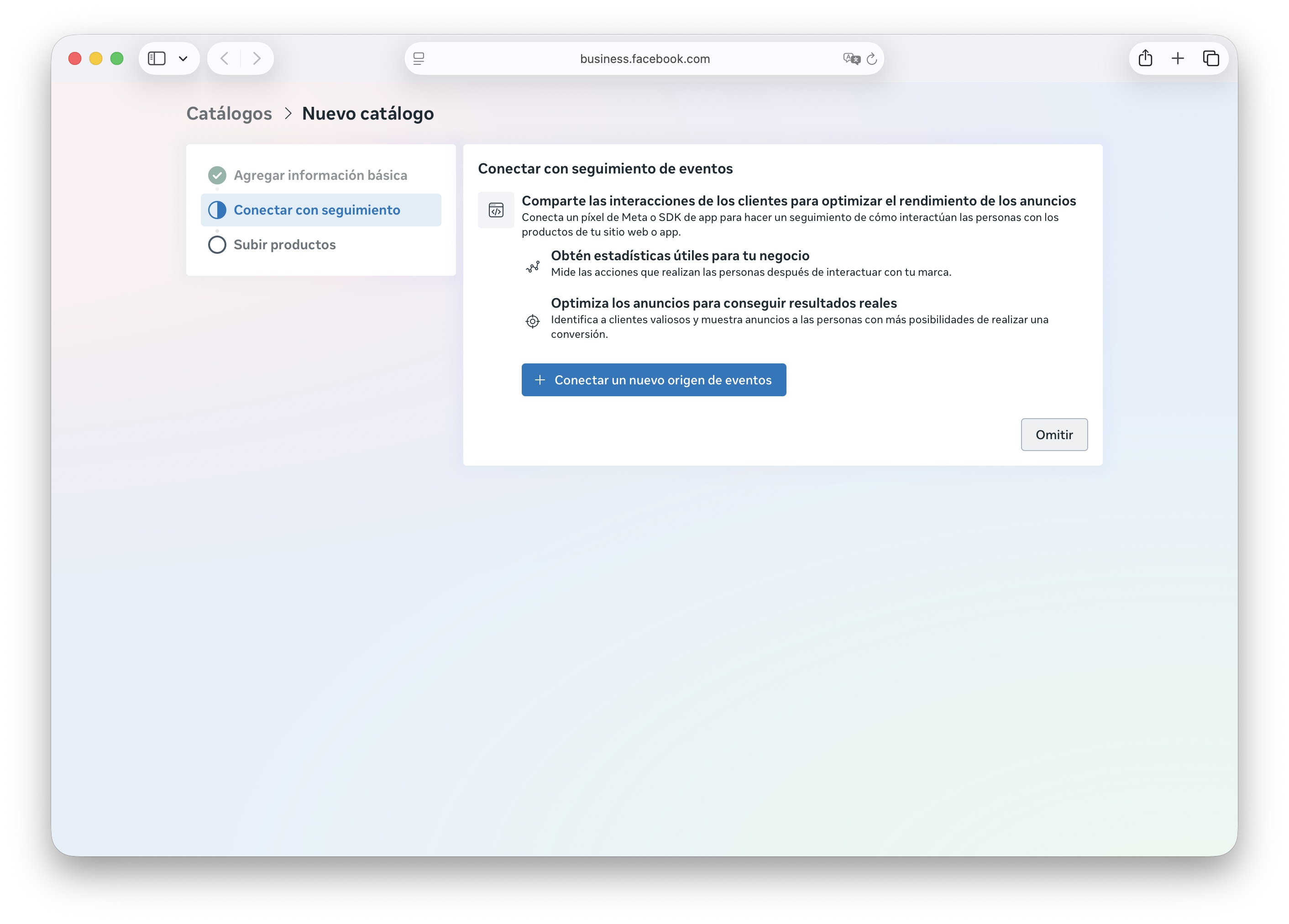 En la siguiente pantalla, Meta te pedirá conectar un origen de eventos (Pixel o SDK). Este paso no es necesario para Hellotext, así que haz clic en Omitir.