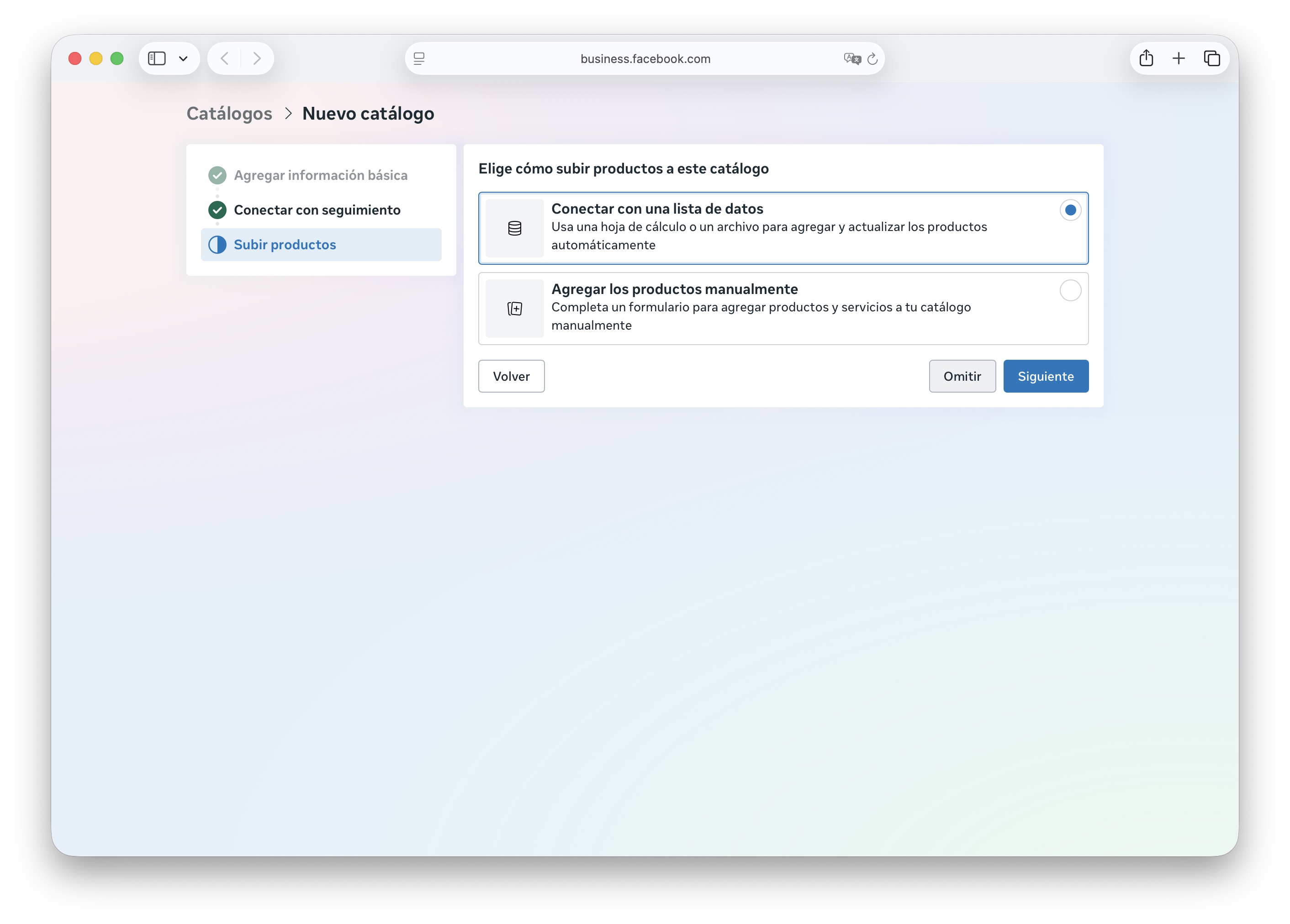 A continuación, Meta te preguntará cómo deseas subir productos al catálogo (lista de datos o carga manual). Tampoco es necesario configurarlo aquí, ya que Hellotext sincronizará los productos automáticamente. Haz clic nuevamente en Omitir.